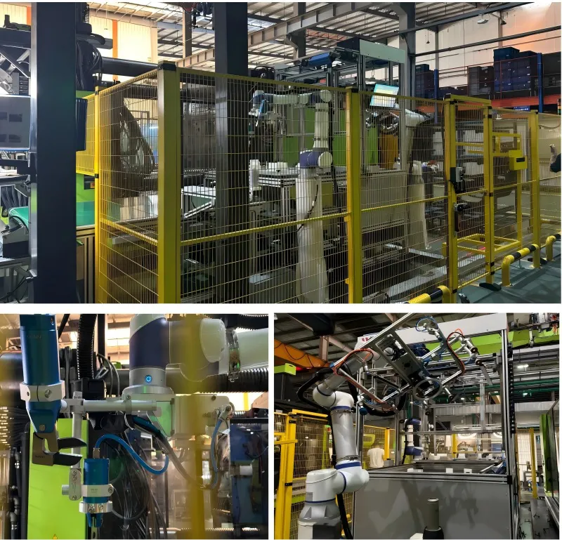 协作机器人搭载定制气动剪刀,定位精度达 ±0.1mm,剪切力可调节(50-200N),适配不同厚度胶口,剪口平整度≤0.05mm,避免损伤门板表面。