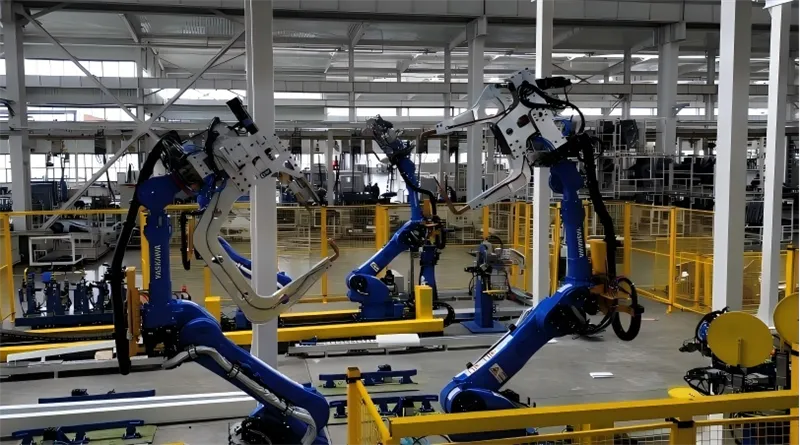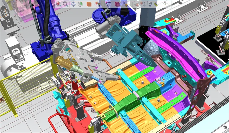根据T77车身前部总成(零件编号EA0-545863X)产品,提供二维图纸、三维数模等资料,完成焊接机器人工作站,和整线的设计、制造、安装、调试、正式投产的全部工作。整体焊接线设计采用安川机器人,前端集成换枪盘,可完成4台机器人,10套前端焊枪的快速切换,并且应用七轴水平移动,用以扩展机器人作业空间,节省机器人数量投入,并且集成自动注胶系统,完成焊接、灌胶、注胶一系列自动作业任务。